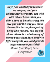 Hey! Just wanted you to know we see you, and your unimaginable strength, and wish with all our hearts that you didn't have to be this strong. We love you and the way you make the world a better place just by being who you are. You are not alone - there is a whole army of Mama Bears right here, ready to fight alongside you, (and provide hugs whenever possible)! Love, Mama (and Papa) Bears Everywhere |