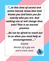 Beloved trans family members, In this time of unrest and active hatred, know that God knows you and loves you for exactly who you are. And nothing can or will change that, ever! That is an eternal promise. And you are also not alone in this world of challenges. There are many, many of us who love you and support you and will defend you. Do not let the loud voices of the haters make you forget that you have allies and support – in the community and in the United Church of Christ. Do not be afraid to reach out to us when you need help or encouragement. You are seen, you are loved, you are precious. Elaine, mother of a gay son and a trans niece |